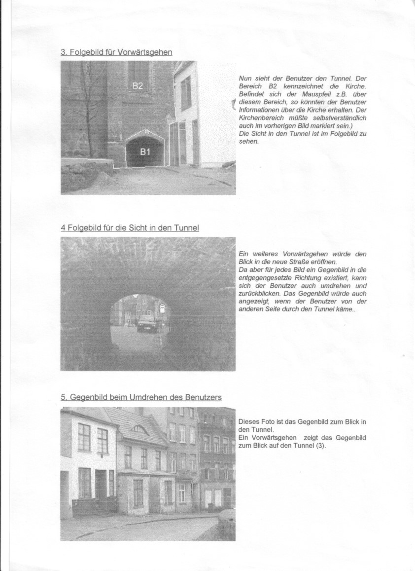 Für den User würden schließlich auf den Fotos Bereiche markiert, die anklickbar sind, um zur nächsten Sichtebene zu gelangen, z.B. um eine Straßenecke biegen. Ebenfalls wären markierte Bereiche für Informationen zu Gebäuden oder Werbung verwaltbar.